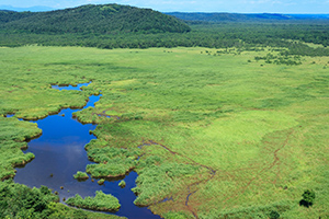 釧路湿原は、湿地の保存についての国際条約「ラムサール条約」に登録された日本最大の湿原です。釧路市の北部から4市町にまたがって広がっており、湿原の中を釧路川が蛇行しながら流れています。