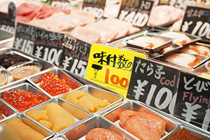 北海道三大市場のひとつ、和商市場は釧路市の釧路駅から歩いて5分程の所にあります。名物の勝手丼は、好きなサイズのご飯を選んで、あとは新鮮なネタを自分で選んで買って載せていきます。その季節の旬の魚介類を手軽に味わうことができます。