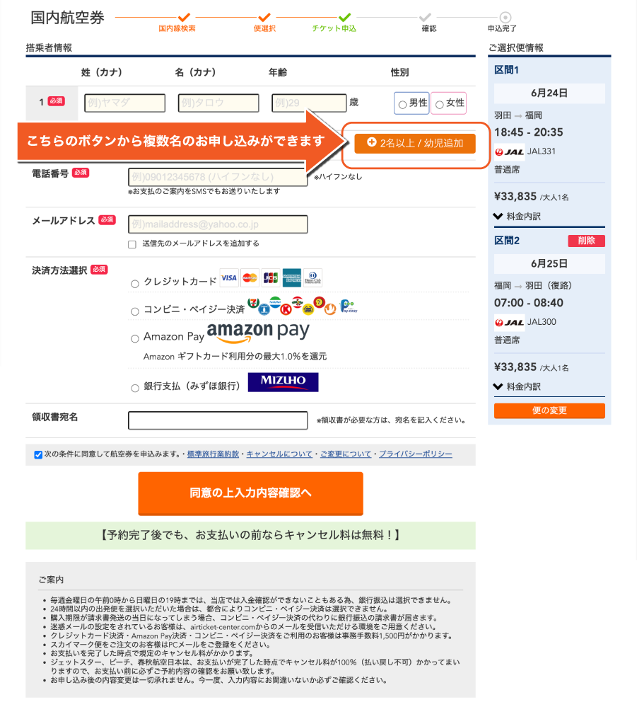 | ご搭乗者様の入力欄 | 搭乗者 | 飛行機をご利用の方の氏名を「カタカナ」でご入力ください。 | 同時に6名(+幼児2名)までお申込みが可能です。 |
