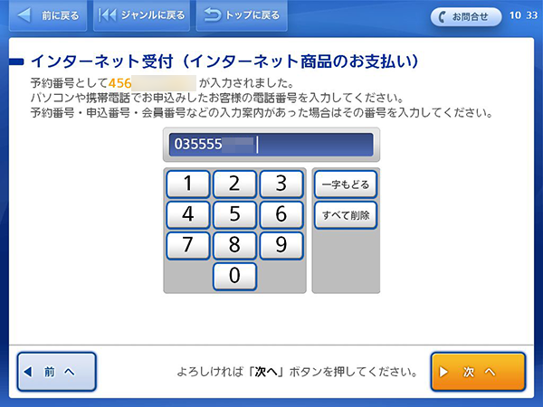 画面に表示されたお支払受付番号と電話番号をメモしてお持ち下さい。