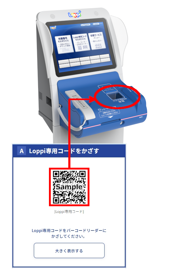 「Loppi専用コード」をミニストップのLoppiにかざしてください(スマホ画面または印刷)。