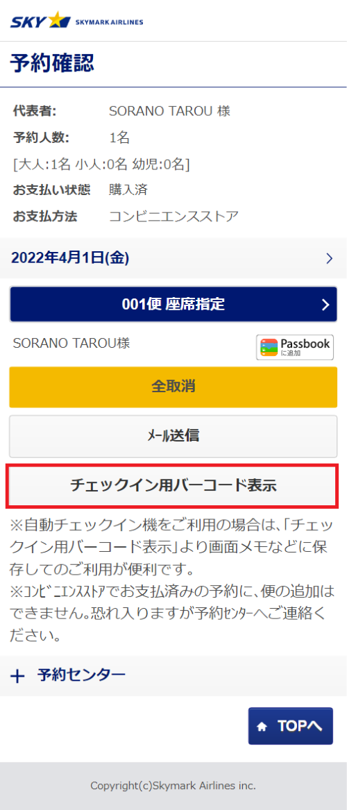 スカイマークで復路や複数区間を予約した場合でも、発行されるチェックイン用バーコードは1つの予約に対して1つです。