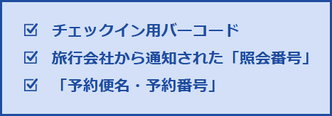 チケット購入時の支払方法によってチェックインに必要なものが変わりますが、基本は「予約番号」か「チェックイン用バーコード」のどちらかがあれば構いません。