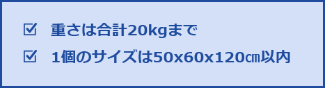 重さは合計20kgまで、1個のサイズは50×60×120cm以内